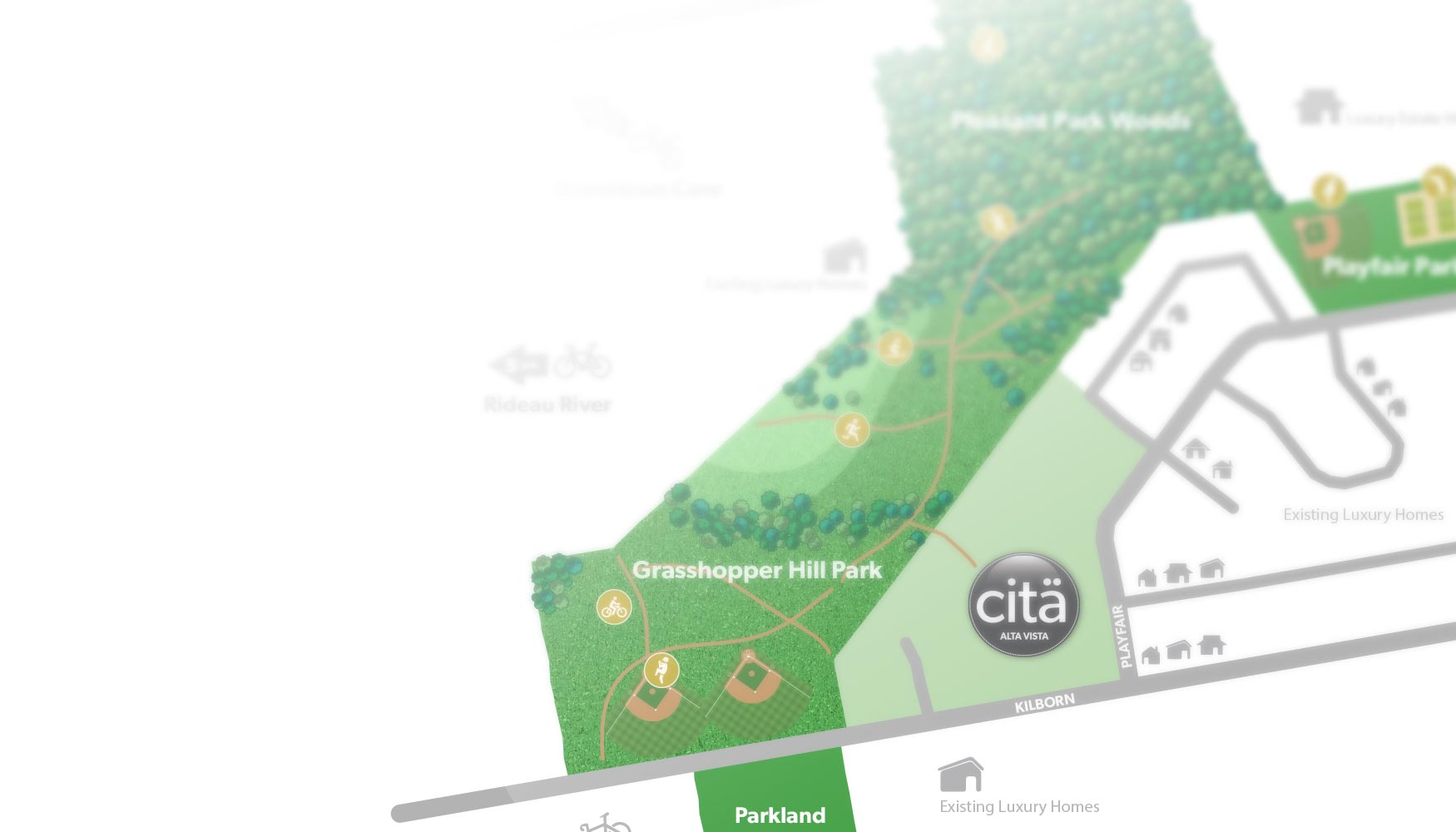 In fact, these parks are part of a larger, continuous block of green spaces running for several kilometres to the north and south. And with easy access to Ottawa's rich bike path network you can cycle downtown in record time, or just hit the trails. Walk, jog, cycle, ski, play... whatever your choice, Citä makes outside living simple.